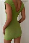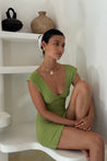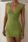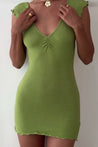 Bijous dress in Leaf. If you adore the Salvita dress, Indah's sell-out spaghetti-strap style, you will fall for its sweet-sleeved sister, Bijous. A stretchy knit mini with a deep V-neck, dressed up with feminine details like picot trim and a flirty lettuce-hem on the sleeves and skirt. Runs true to size. Aisha wears size S. Sabi wears size S. Lente wears size XS. Noemie wears size S.