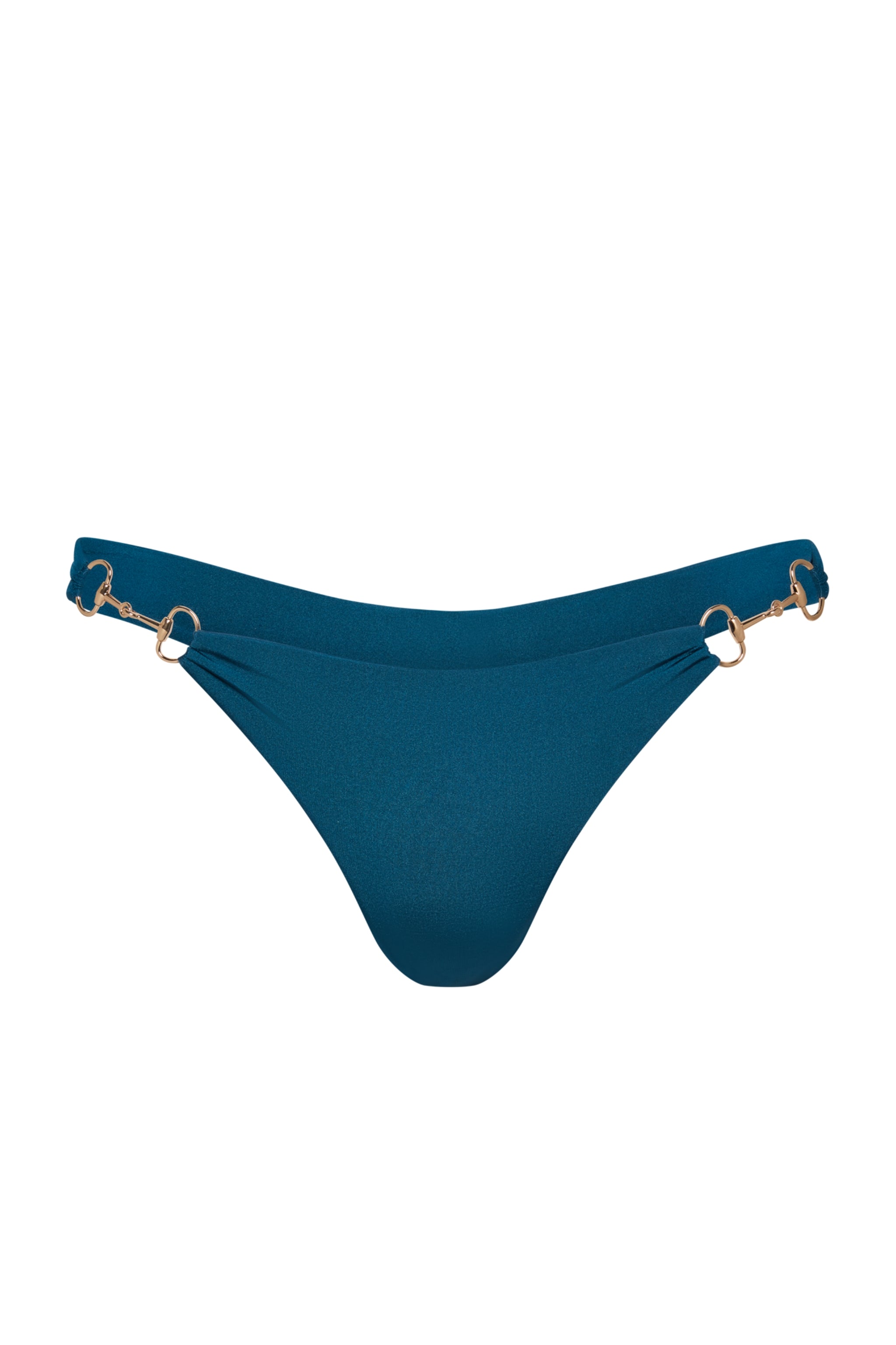 Provocative by design, sustainable by nature. Justine is crafted from 100% regenerated Italian Econyl, featuring a cheeky back and a low-rise front. Adorned with polished gold buckles at the hips, adding a jewelry-like finish to your poolside fit, pair it with Cleo for a complete set.