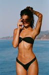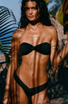 Lara top in Licorice. Crafted from a Brazilian supplex nylon blend, this classic bandeau top has a glossy, ultra- soft texture—one of the most stunning fabric blends in swimwear. A middle twist and pitch gathers at the center in an elevated detail. Laura wears size S. Rachelle wears size S.