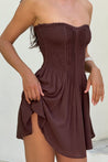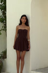 Wren dress in Cacau. A new take on the classic mini dress, Wren is effortless and feminine. Designed in a decadent espresso hue, this strapless beauty features a flattering sweetheart neckline and a shirred side body that perfectly hugs your waist. Pleats release into a flirty, gathered skirt for beautiful movement. Fully lined. Aisha wears size S.