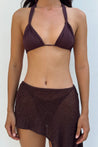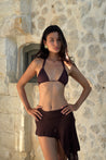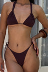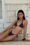August top in Modica. This essential bikini top features unique slip knot details on the halter to create a flattering, perfect triangle top fit. Lovely for any bust size, the unique fabric blend mimics the compression and comfort of high-performance yoga wear, giving you instant lift and support. Pair it with the Playa bottom to complete the look. Aisha wears size S.