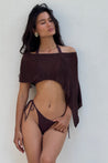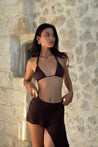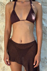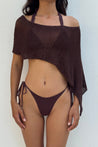 Gia shawl/skirt in Modica. Gia is a true seasonless staple and the most versatile coverup. Crafted in the perfect matching espresso hue to pair with both swim and RTW. Wear it over your favorite bikini for a bit of added coverage or drape it as a chic top with jeans or a skirt. Hand-knit in a luxurious fancy yarn, Gia is the perfect final touch to any outfit. Aisha wears size S.