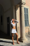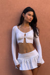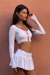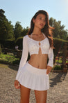 Haruki sweater in White. A sweet & versatile essential, elevate your outfit with the Haruki cardigan. Hand-knit in a soft spandex blend, this ultra-cropped button-front cardi is the perfect addition to any ensemble.