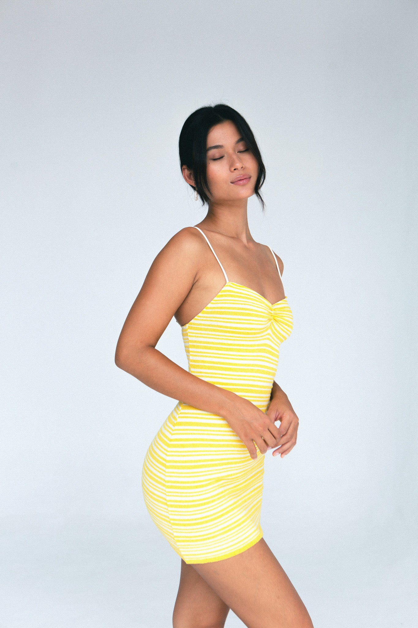 The Claire mini dress is a tribute to the quintessential 90s aesthetic. Crafted from a custom Spandex blend handknit that feels incredible on the body, the ultra-fine spaghetti straps and bright yellow and white stripe pattern create the perfect finish for this sweet, nostalgic look.