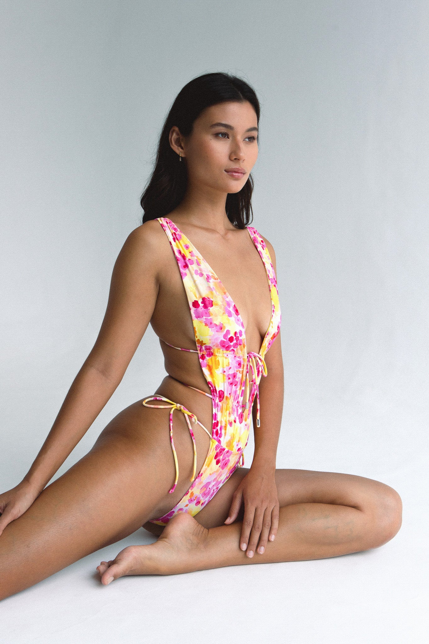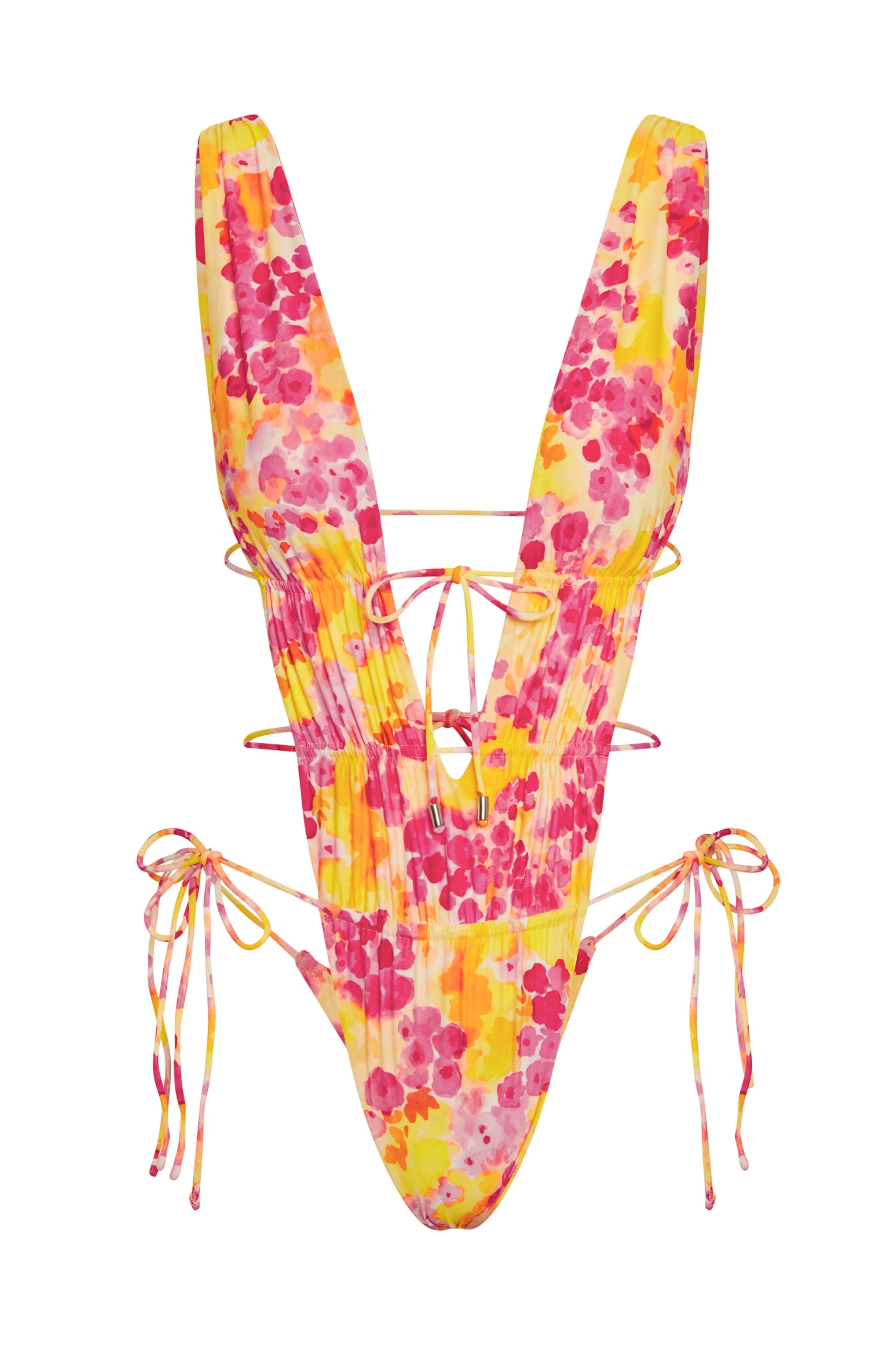 Sweet on the surface, but with a daringly skimpy edge. The Heart of Gold one-piece features a delicate, watercolor-effect floral print exclusive to this collection—capturing a dreamy wash of sunshine yellow and soft rose.