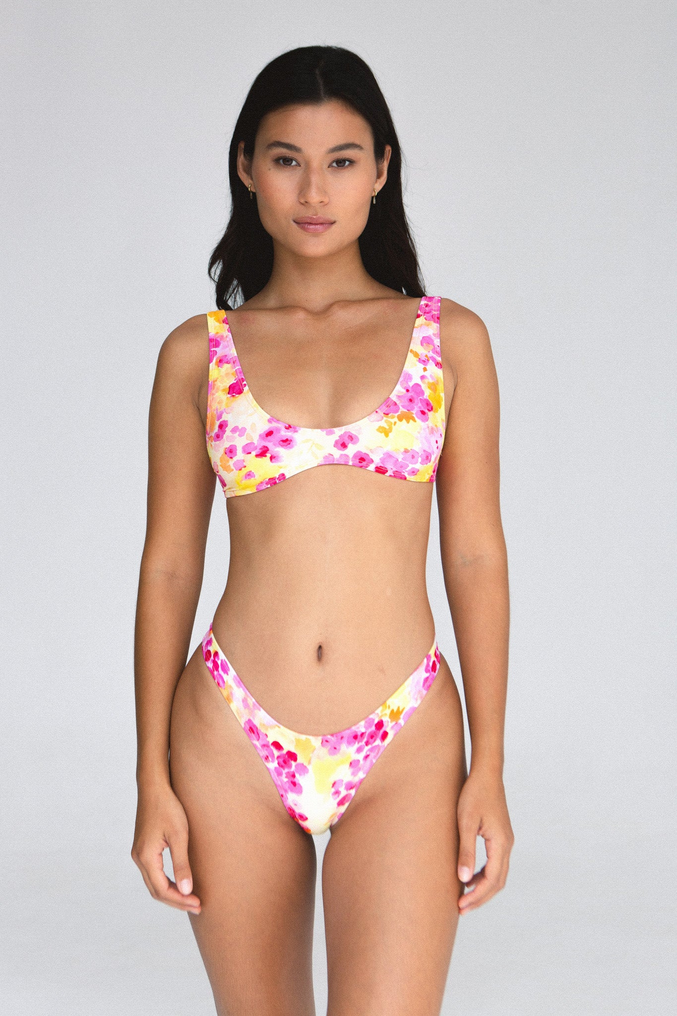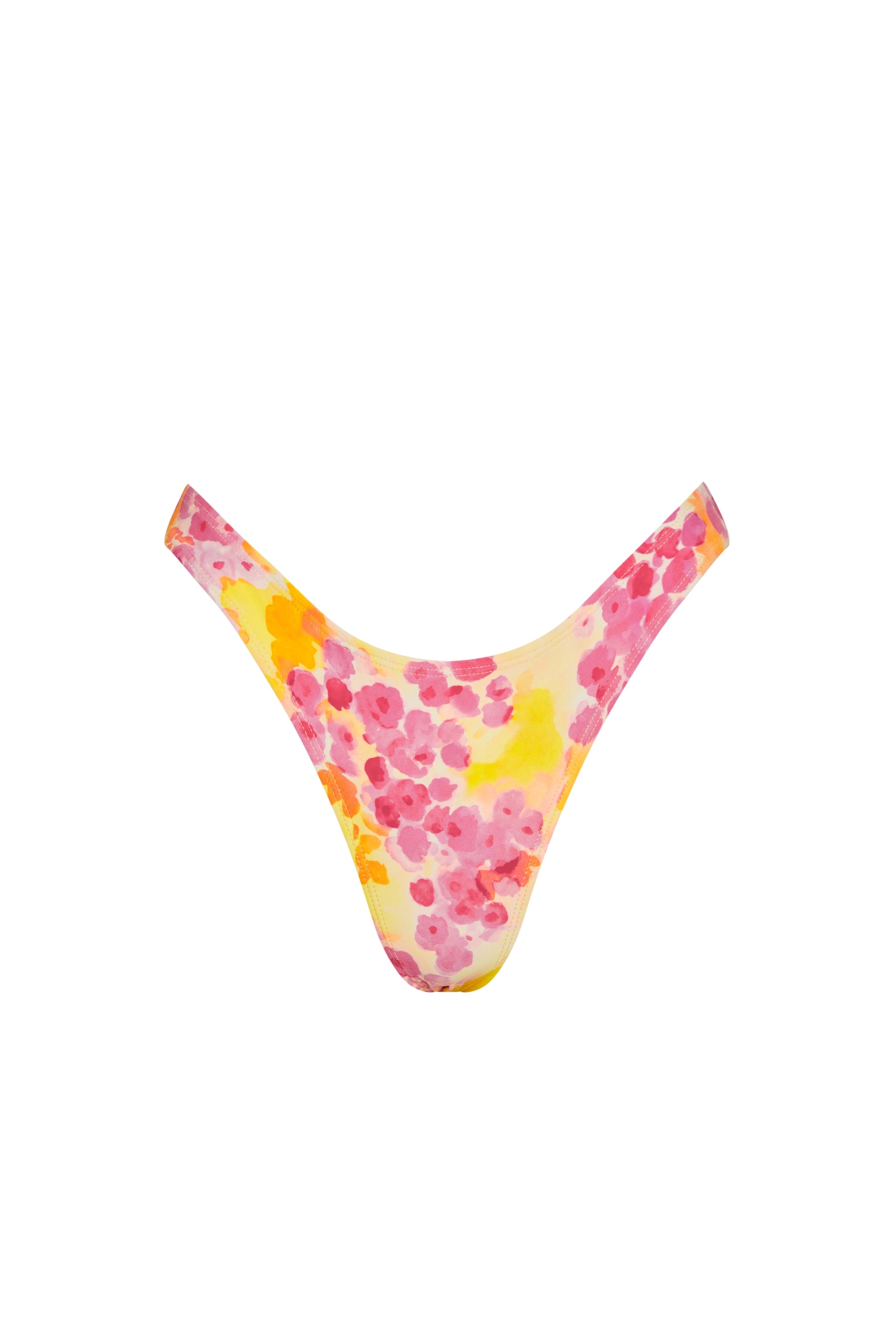 Designed with a slightly athletic, fixed silhouette, Monica is crafted from Italian Matte Tissue Supplex, offering a second-skin feel that stays in place all day. Finished in our dreamy Romance print—a watercolor wash of pale yellow and soft pink—this bottom is as adorable as it is functional.