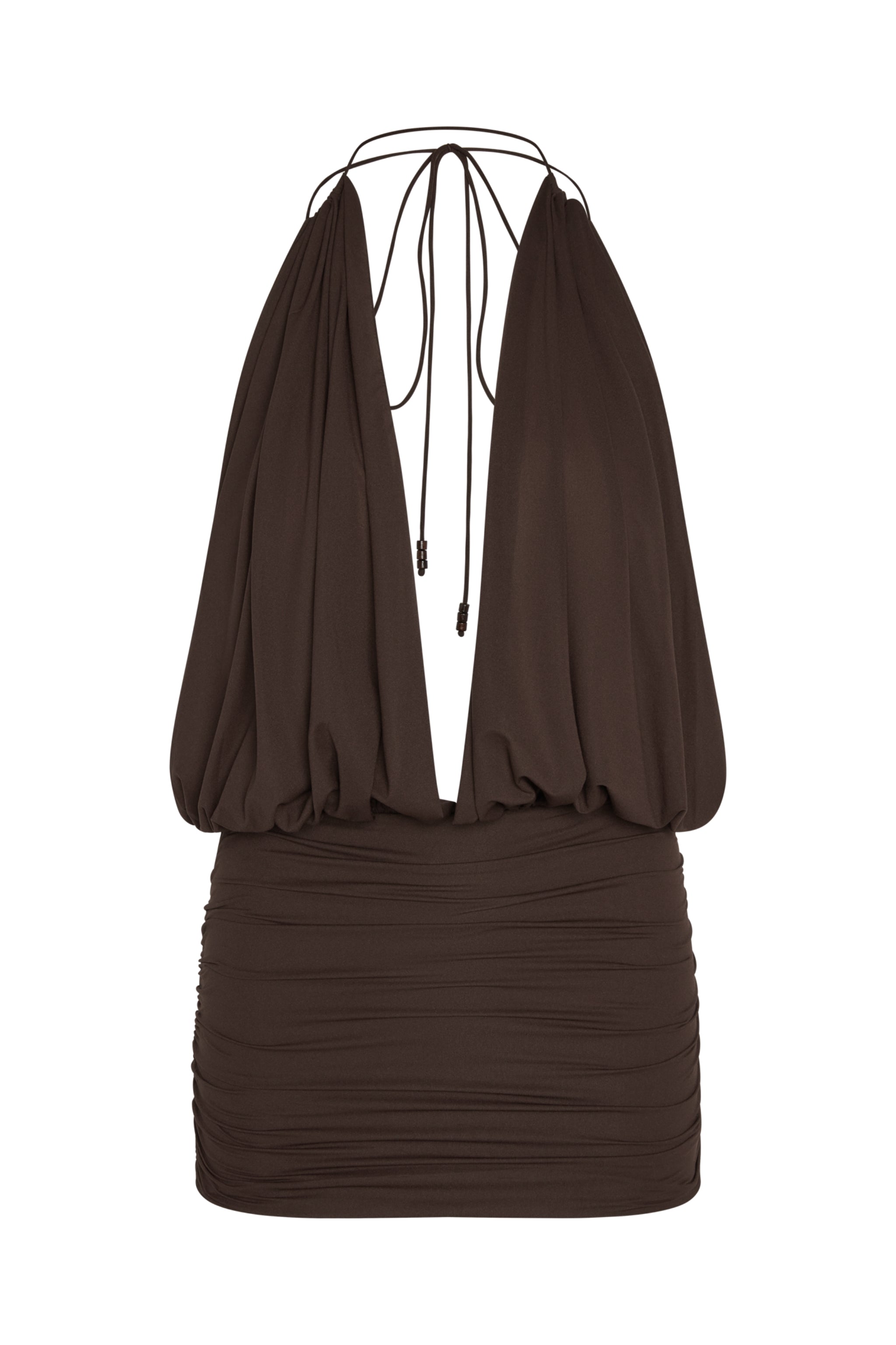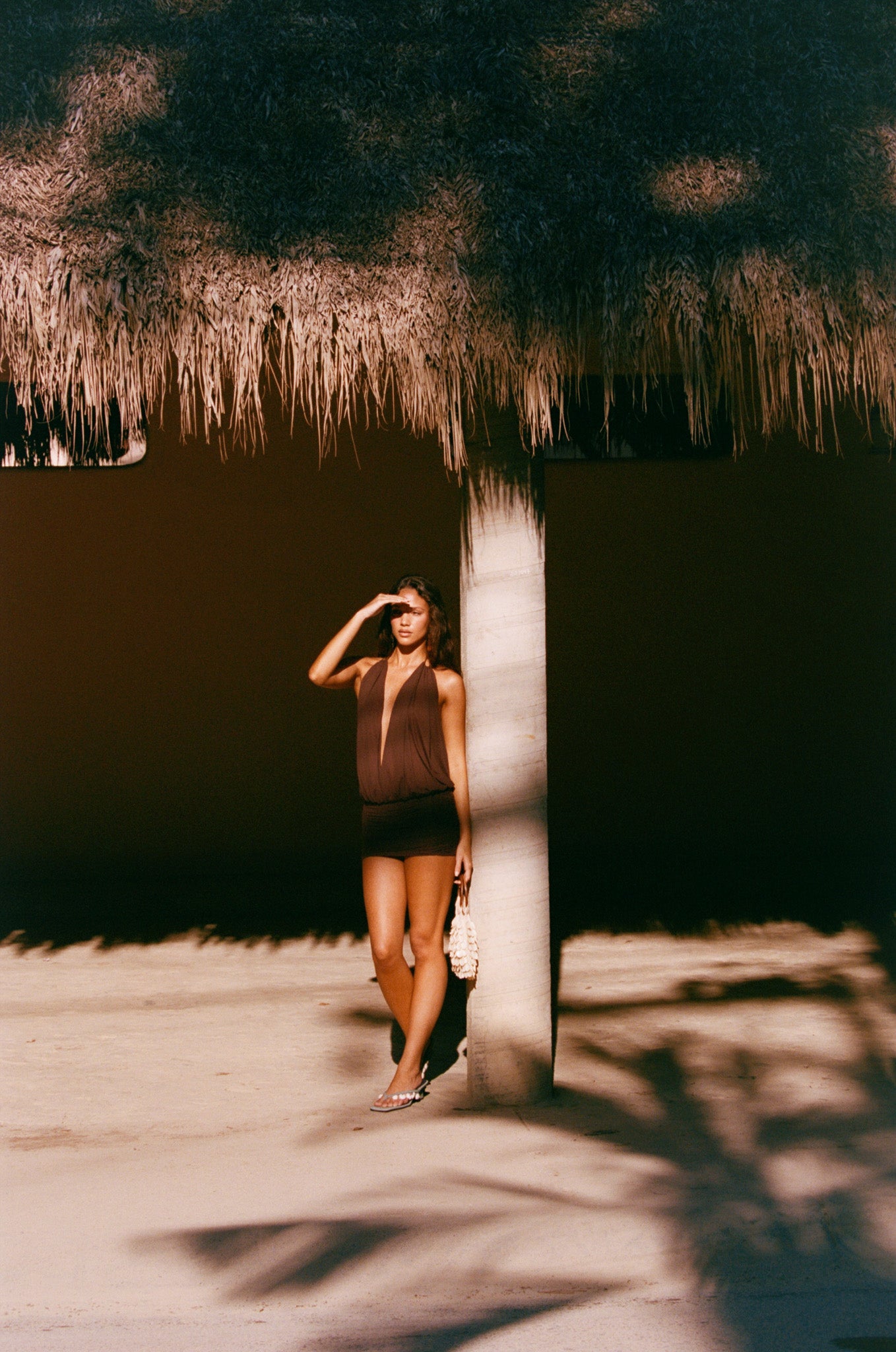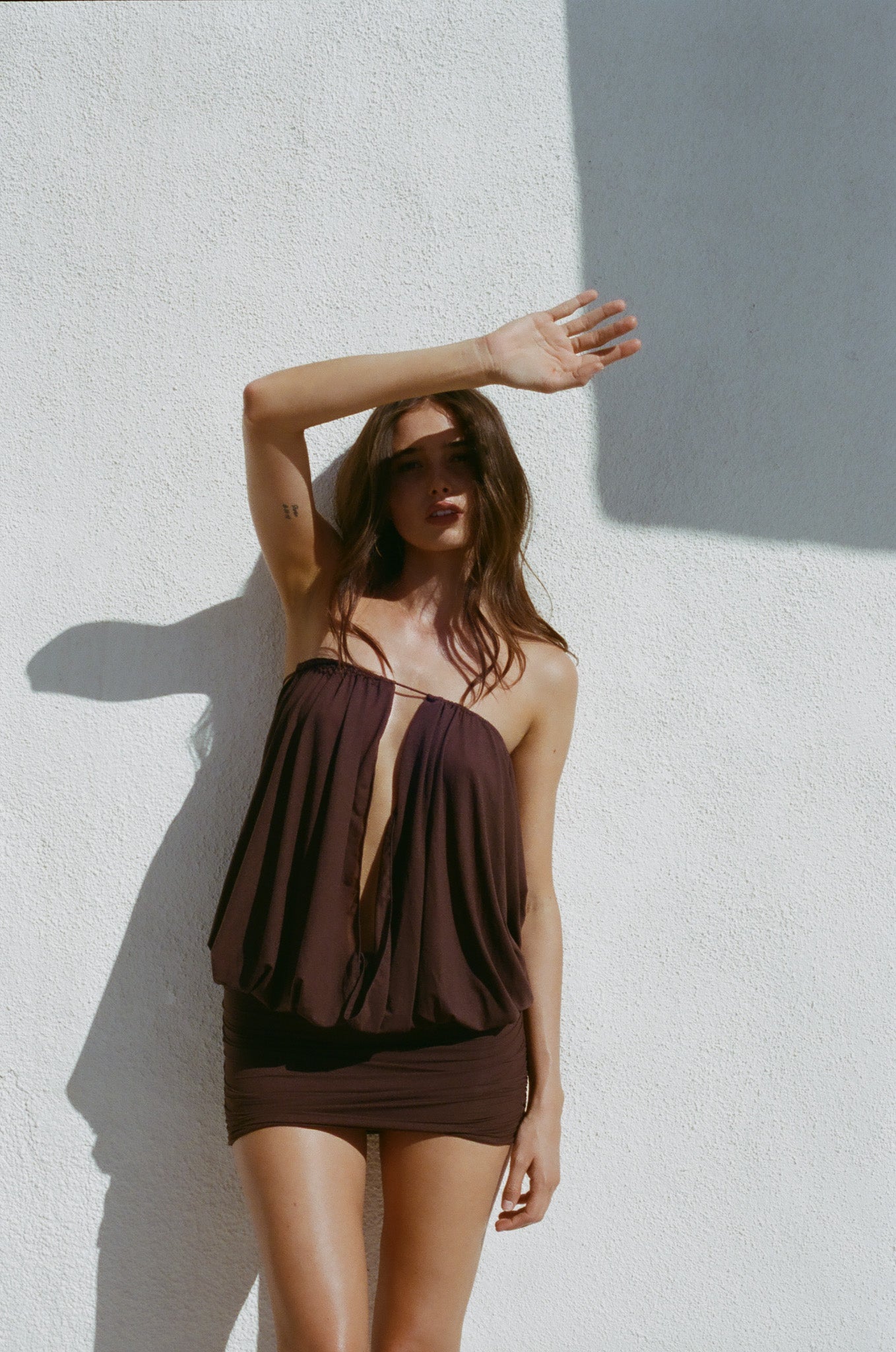 Can be worn strapless or halter. Featuring a daring center-slit detail, the Margaret mini dress balances a relaxed, gathered bodice with a form-fitting micro hem. Rendered in the deep, earthen Kopi hue and crafted from premium Italian Mesh Soul Eco, Margaret offers the perfect airy silhouette for moonlit evenings.