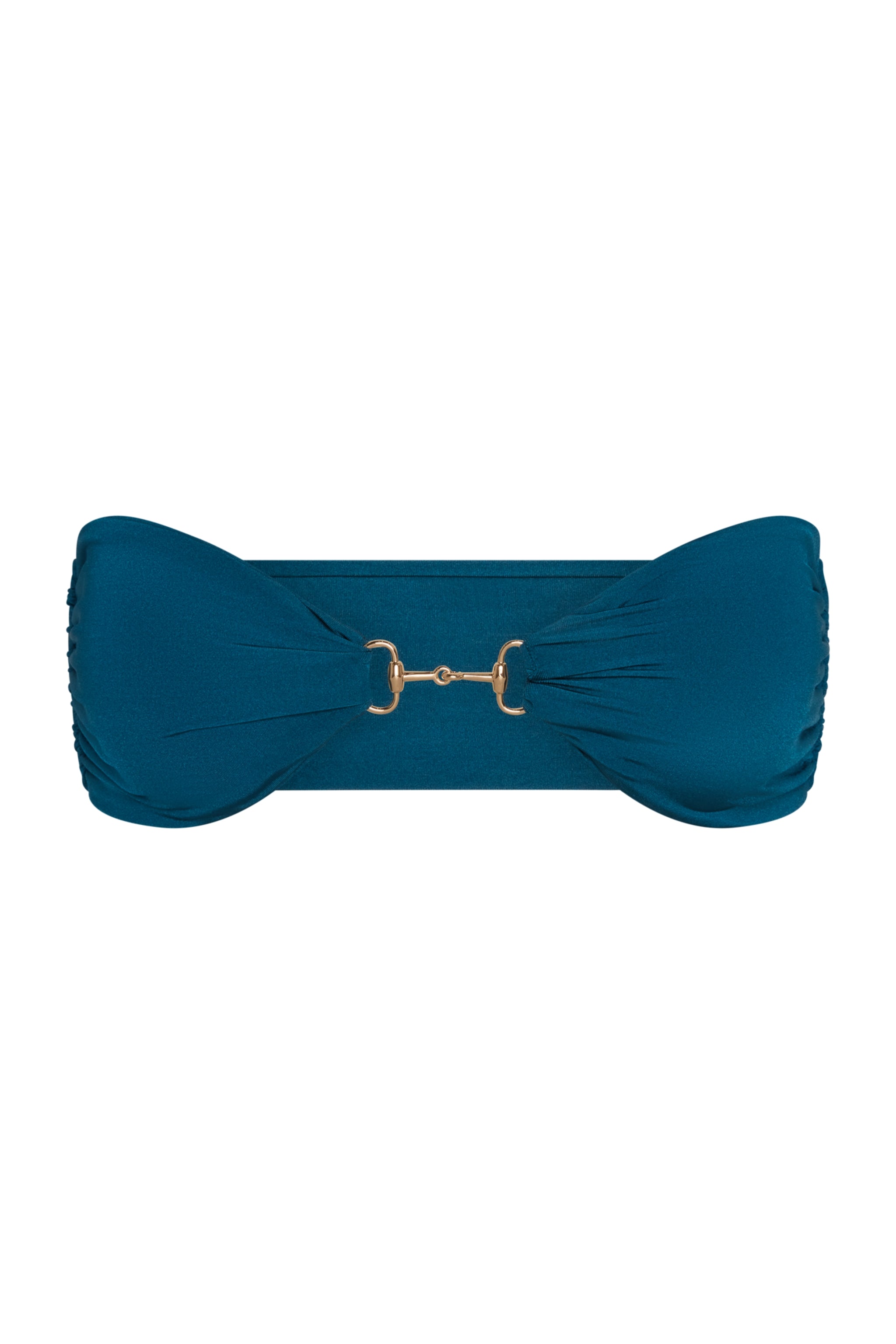 Saturated in deep Adriatic blue, the Cleo bandeau is distinguished by polished gold hardware and a subtle gathered fit. Crafted from premium Italian Econyl, this minimalist silhouette offers a smooth, luxe feel with a sharp, modern edge. Perfectly paired with Justine.