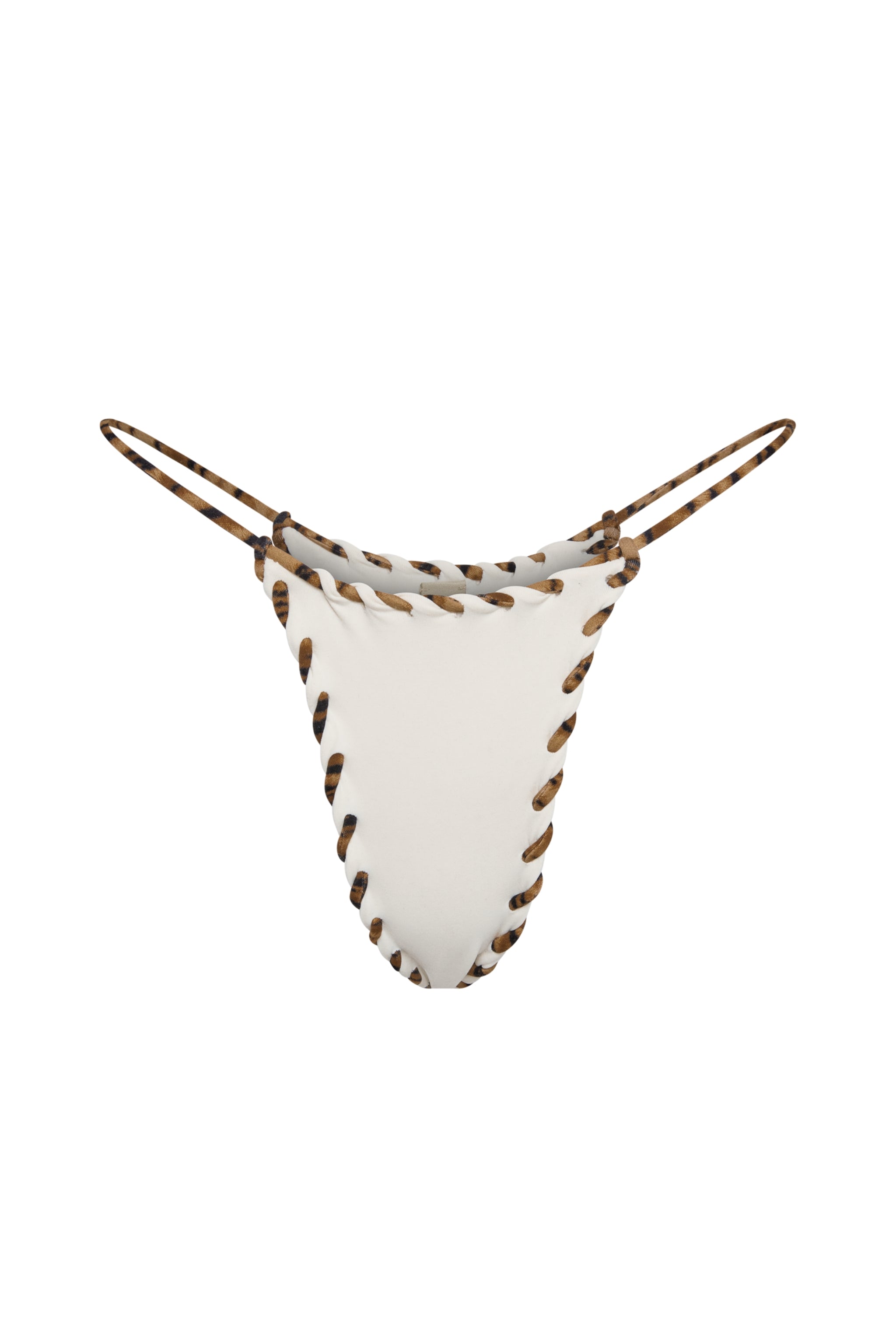 Featuring a high-contrast, tiger-printed whipstitch trim, the ultra-skimpy Trish bikini bottom is crafted from Italian matte tissue supplex in a rich ivory tone. The fixed string sides can be worn high on the leg or placed lower on the hips for a custom silhouette.